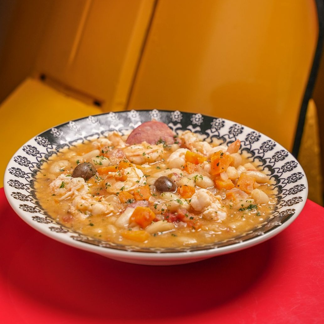 Feijão branco cozido no caldo de camarão, com toques de cenoura, salsa e cebolinha. Camarões refogados no azeite, bacon crocante e linguiça artesanal flambados no vinho branco. Tudo isso acompanhado de um arroz soltinho.